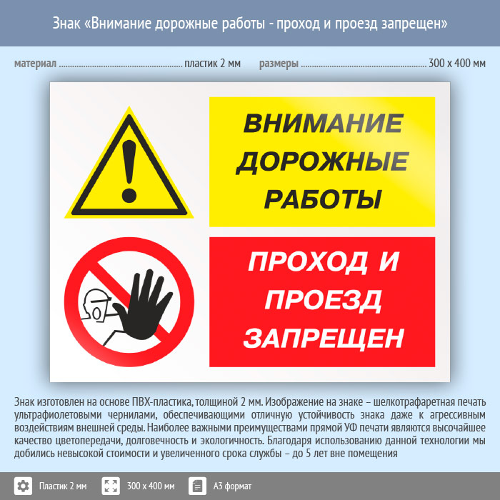 Знак «Внимание дорожные работы - проход и проезд запрещен», КЗ-14 на пластике, размером 400х300 мм предупреждает о проведении дорожных работ, где всякое передвижение является нарушением. Комбинированные знаки безопасности состоят из основных и дополнительных знаков с поясняющими надписями и предназначены для изложения комплексных требований, направленных на обеспечение безопасности