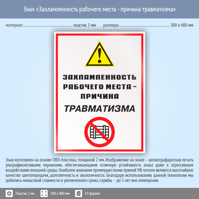Знак «Захламленность рабочего места - причина травматизма», КЗ-21 на пластике, размером 300х400 мм напоминает о содержании рабочего места в чистоте. Комбинированные знаки безопасности состоят из основных и дополнительных знаков с поясняющими надписями и предназначены для изложения комплексных требований, направленных на обеспечение безопасности
