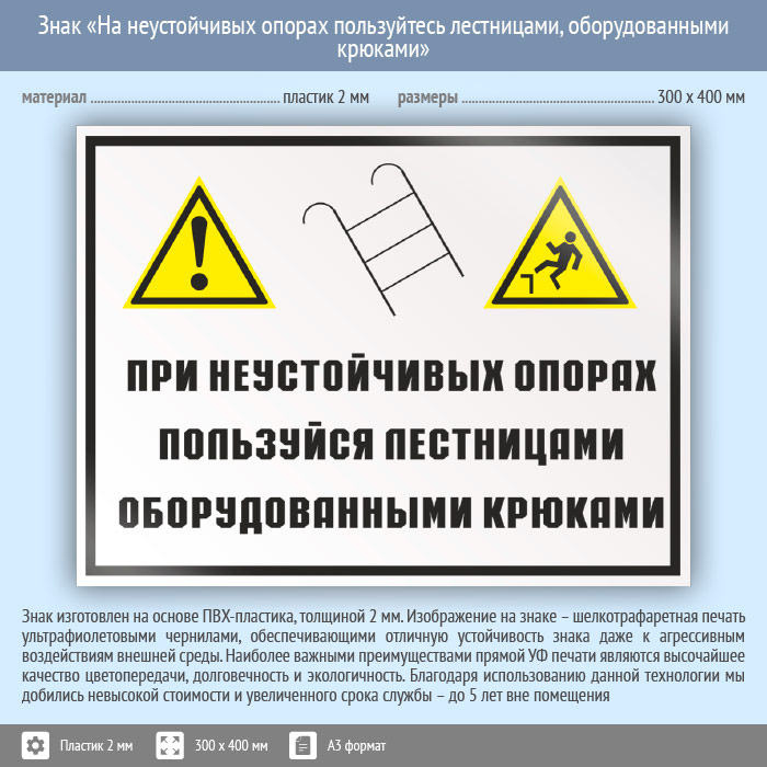 Знак «На неустойчивых опорах пользуйтесь лестницами, оборудованными крюками», КЗ-22 на пластике, размером 400х300 мм напоминает о правилах работы с ненадежными опорами. Комбинированные знаки безопасности состоят из основных и дополнительных знаков с поясняющими надписями и предназначены для изложения комплексных требований, направленных на обеспечение безопасности