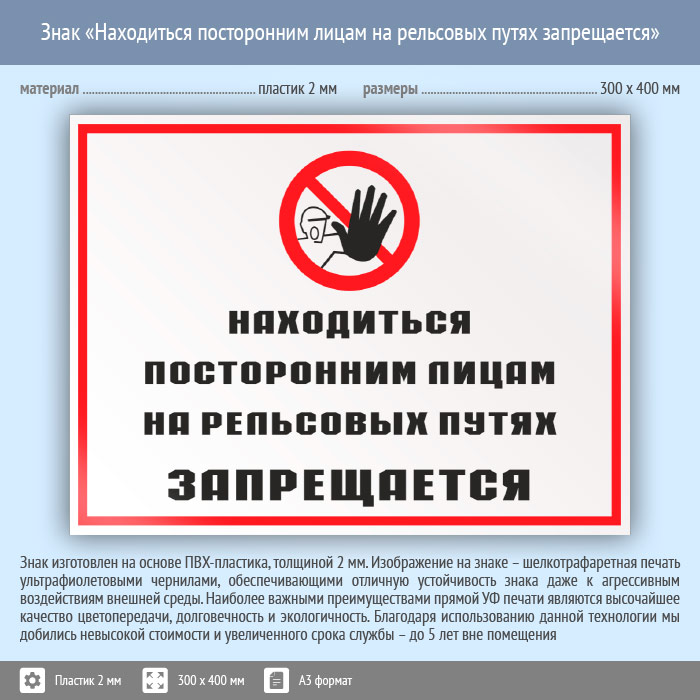 Знак «Находиться посторонним лицам на рельсовых путях запрещается», КЗ-25 на пластике, размером 400х300 мм предупреждает посторонних, что им находиться здесь небезопасно и запрещено. Комбинированные знаки безопасности состоят из основных и дополнительных знаков с поясняющими надписями и предназначены для изложения комплексных требований, направленных на обеспечение безопасности