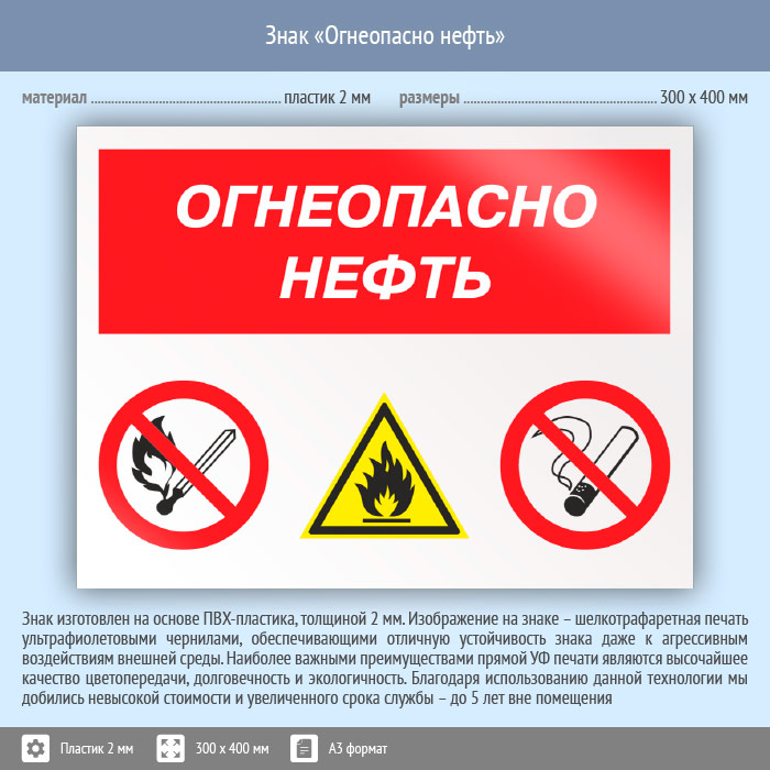 Знак «Огнеопасно нефть», КЗ-31 на пластике, размером 400х300 мм размещается в местах хранения нефти и предупреждает о возможной опасности использования открытого огня. Комбинированные знаки безопасности состоят из основных и дополнительных знаков с поясняющими надписями и предназначены для изложения комплексных требований, направленных на обеспечение безопасности