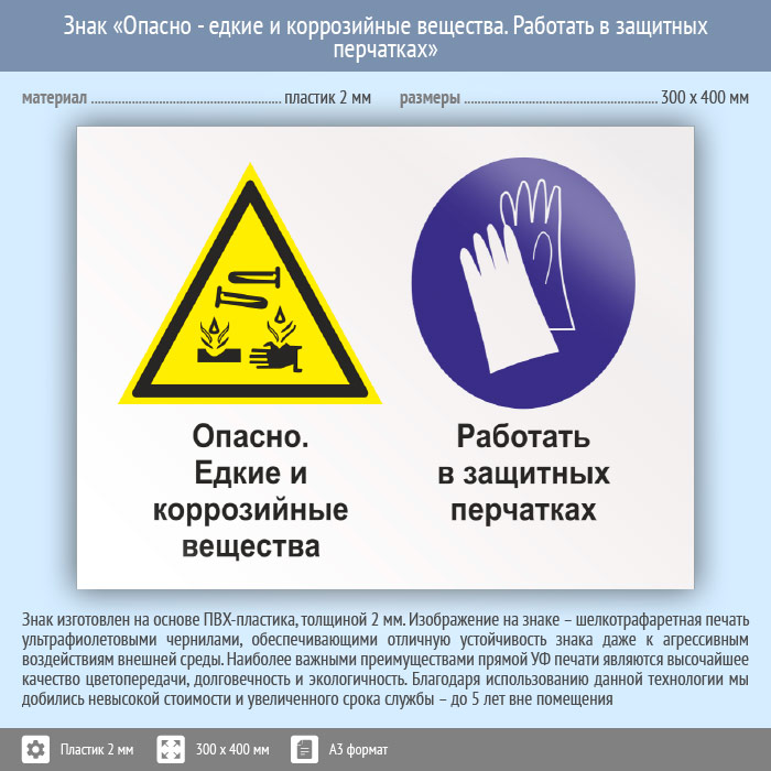 Знак «Опасно - едкие и коррозийные вещества. Работать в защитных перчатках», КЗ-36 на пластике, размером 400х300 мм обозначает место, где используются едкие химические вещества и предписывает использовать средства защиты рук. Комбинированные знаки безопасности состоят из основных и дополнительных знаков с поясняющими надписями и предназначены для изложения комплексных требований, направленных на обеспечение безопасности