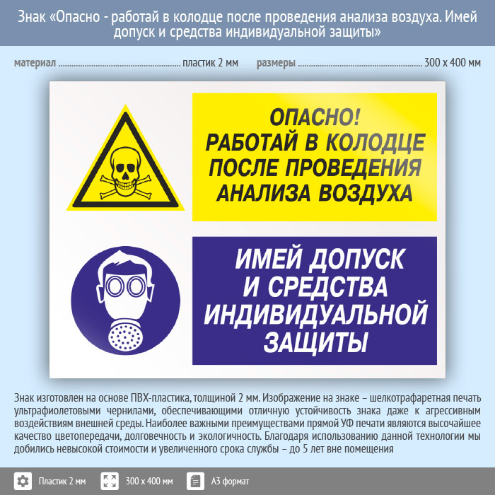 Знак «Опасно - работай в колодце после проведения анализа воздуха. Имей допуск и средства индивидуальной защиты», КЗ-40 на пластике, размером 400х300 мм напоминает о взятии проб качества воздуха перед работой и важности санкционированного доступа и использования СИЗ. Комбинированные знаки безопасности состоят из основных и дополнительных знаков с поясняющими надписями и предназначены для изложения комплексных требований, направленных на обеспечение безопасности