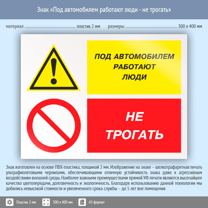 Знак «Под автомобилем работают люди - не трогать», КЗ-66 на пластике, размером 400х300 мм говорит о том, что человек работает и трогать его не надо. Комбинированные знаки безопасности состоят из основных и дополнительных знаков с поясняющими надписями и предназначены для изложения комплексных требований, направленных на обеспечение безопасности