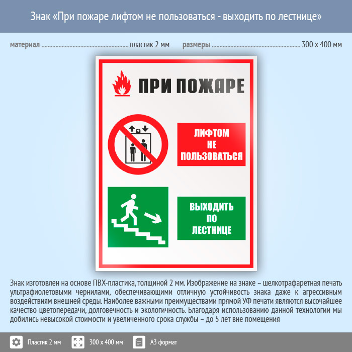 Знак «При пожаре лифтом не пользоваться - выходить по лестнице», КЗ-73 на пластике, размером 300х400 мм напомнит об опасности использования лифта во время пожара. Комбинированные знаки безопасности состоят из основных и дополнительных знаков с поясняющими надписями и предназначены для изложения комплексных требований, направленных на обеспечение безопасности