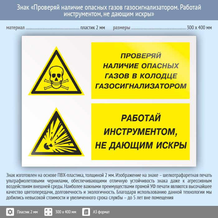 Знак «Проверяй наличие опасных газов газосигнализатором. Работай инструментом, не дающим искры», КЗ-77 на пластике, размером 400х300 мм рекомендует использовать газоанализатор и пожаробезопасный инструмент. Комбинированные знаки безопасности состоят из основных и дополнительных знаков с поясняющими надписями и предназначены для изложения комплексных требований, направленных на обеспечение безопасности