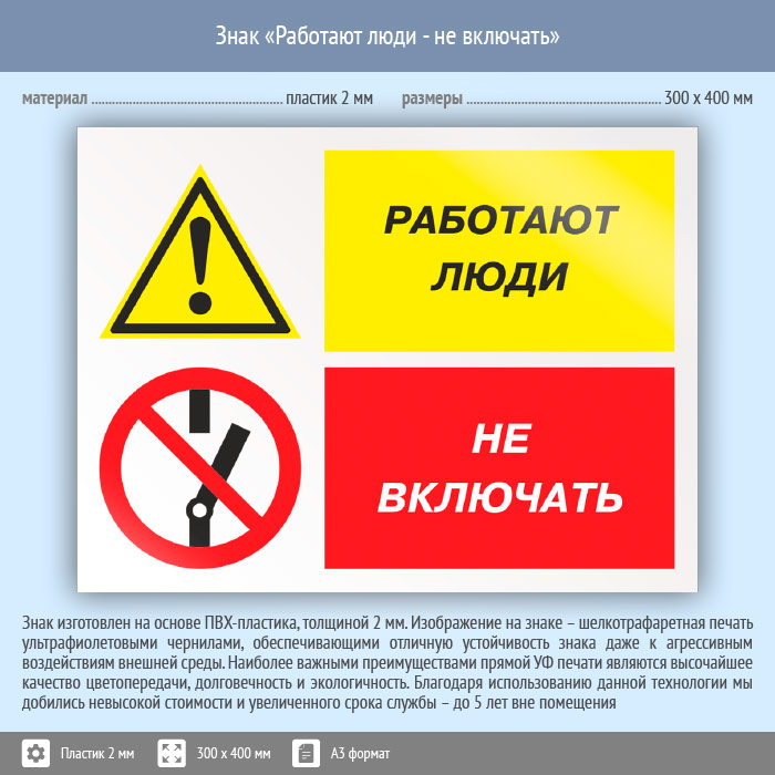 Знак «Работают люди - не включать», КЗ-83 на пластике, размером 400х300 мм предупреждает о работе людей и запрещает включать то, что находится в зоне действия знака. Комбинированные знаки безопасности состоят из основных и дополнительных знаков с поясняющими надписями и предназначены для изложения комплексных требований, направленных на обеспечение безопасности