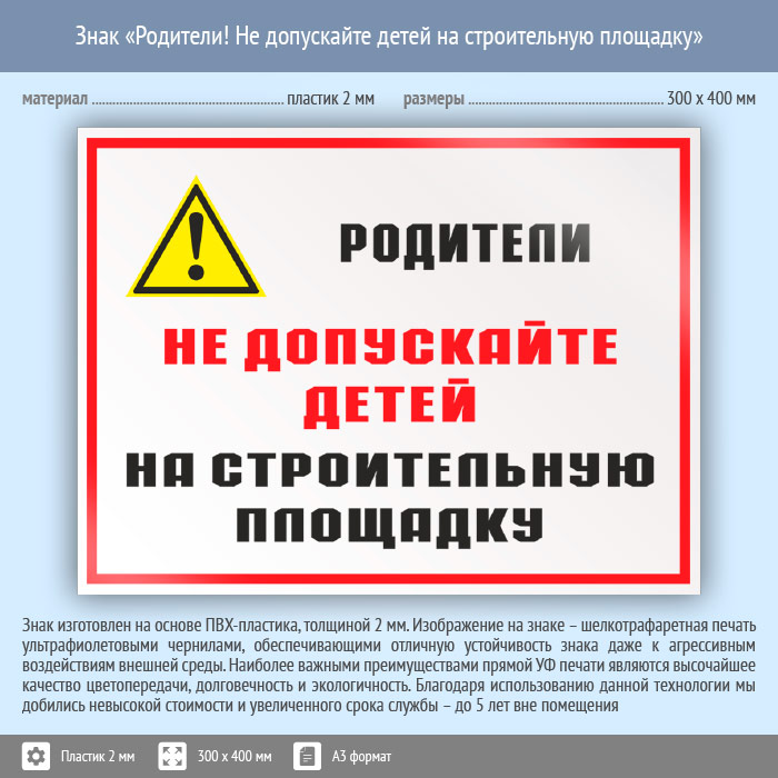 Знак «Родители! Не допускайте детей на строительную площадку», КЗ-84 на пластике, размером 400х300 мм настоятельно рекомендует родителям внимательней следить за своими детьми и не отпускать детей гулять на строительную площадку. Комбинированные знаки безопасности состоят из основных и дополнительных знаков с поясняющими надписями и предназначены для изложения комплексных требований, направленных на обеспечение безопасности