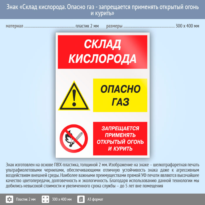 Знак «Склад кислорода. Опасно газ - запрещается применять открытый огонь и курить», КЗ-85 на пластике, размером 300х400 мм размещается в местах складирования баллонов с газом и кислородом, знак запрещает использовать огонь и курение. Комбинированные знаки безопасности состоят из основных и дополнительных знаков с поясняющими надписями и предназначены для изложения комплексных требований, направленных на обеспечение безопасности