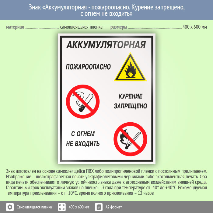 Знак «Аккумуляторная - пожароопасно. Курение запрещено, с огнем не входить», КЗ-01 на пленке, размером 400х600 мм размещается в аккумуляторных с повышенной категорией огне- и взрывоопасности. Комбинированные знаки безопасности состоят из основных и дополнительных знаков с поясняющими надписями и предназначены для изложения комплексных требований, направленных на обеспечение безопасности