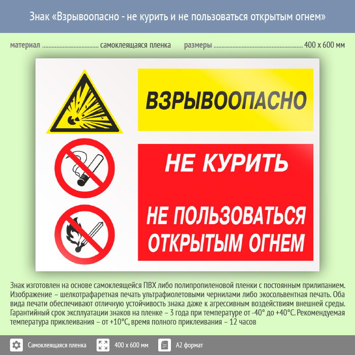 Знак «Взрывоопасно - не курить и не пользоваться открытым огнем», КЗ-09 на пленке, размером 600х400 мм настоятельно не рекомендует курить, а тем более использовать огонь в данном помещении, в связи с повышенной взрывоопасностью. Комбинированные знаки безопасности состоят из основных и дополнительных знаков с поясняющими надписями и предназначены для изложения комплексных требований, направленных на обеспечение безопасности
