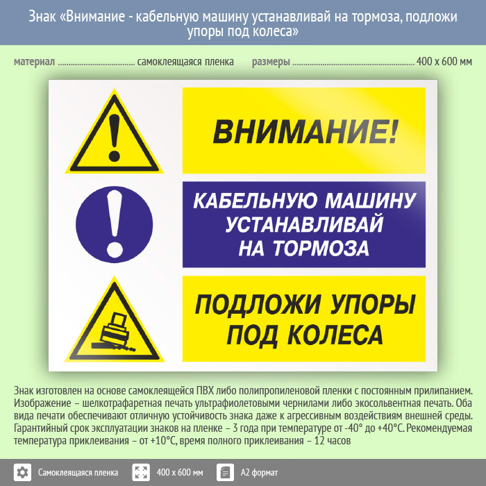 Знак «Внимание - кабельную машину устанавливай на тормоза, подложи упоры под колеса», КЗ-12 на пленке, размером 600х400 мм говорит сам за себя, что и как делать. Комбинированные знаки безопасности состоят из основных и дополнительных знаков с поясняющими надписями и предназначены для изложения комплексных требований, направленных на обеспечение безопасности