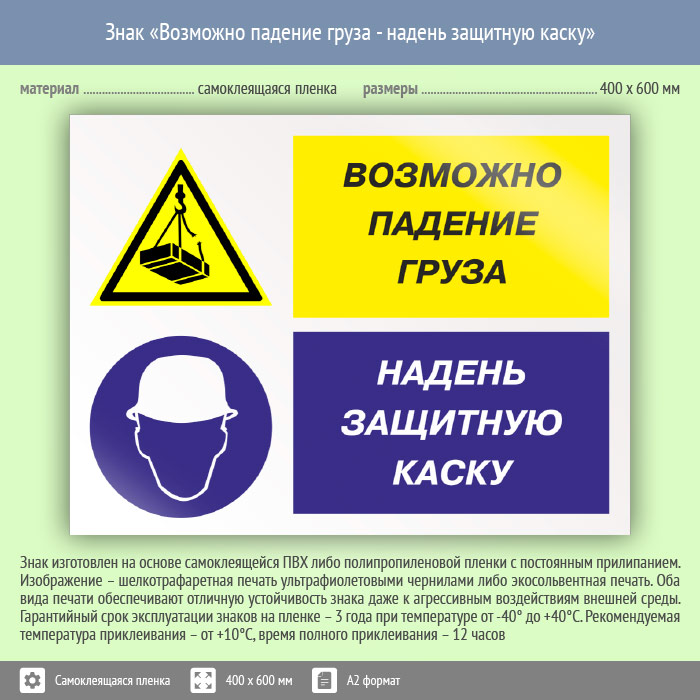 Знак «Возможно падение груза - надень защитную каску», КЗ-17 на пленке, размером 600х400 мм говорит о том, что без средств защиты головы, мы довольно беззащитные при падении сверху груза. Комбинированные знаки безопасности состоят из основных и дополнительных знаков с поясняющими надписями и предназначены для изложения комплексных требований, направленных на обеспечение безопасности