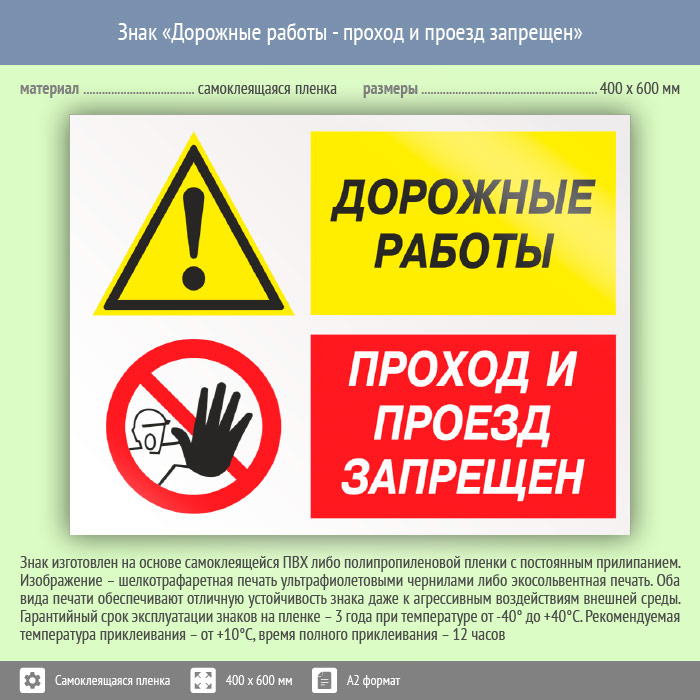 Знак «Дорожные работы - проход и проезд запрещен», КЗ-20 на пленке, размером 600х400 мм указывает, что проводятся дорожные работы и проход посторонним, а тем более проезд на данном участке закрыт. Комбинированные знаки безопасности состоят из основных и дополнительных знаков с поясняющими надписями и предназначены для изложения комплексных требований, направленных на обеспечение безопасности