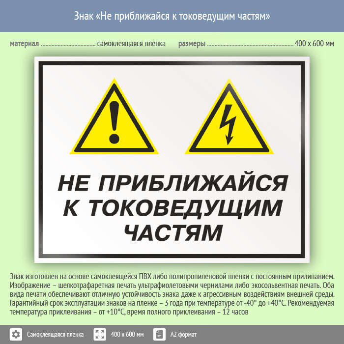 Знак «Не приближайся к токоведущим частям», КЗ-29 на пленке, размером 600х400 мм напоминает об опасности поражения электрическим током. Комбинированные знаки безопасности состоят из основных и дополнительных знаков с поясняющими надписями и предназначены для изложения комплексных требований, направленных на обеспечение безопасности