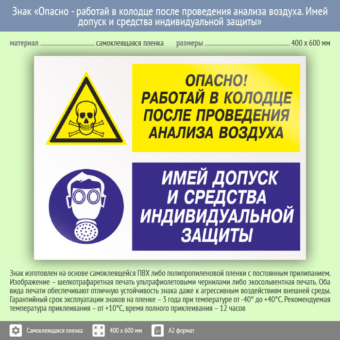 Знак «Опасно - работай в колодце после проведения анализа воздуха. Имей допуск и средства индивидуальной защиты», КЗ-40 на пленке, размером 600х400 мм напоминает о взятии проб качества воздуха перед работой и важности санкционированного доступа и использования СИЗ. Комбинированные знаки безопасности состоят из основных и дополнительных знаков с поясняющими надписями и предназначены для изложения комплексных требований, направленных на обеспечение безопасности