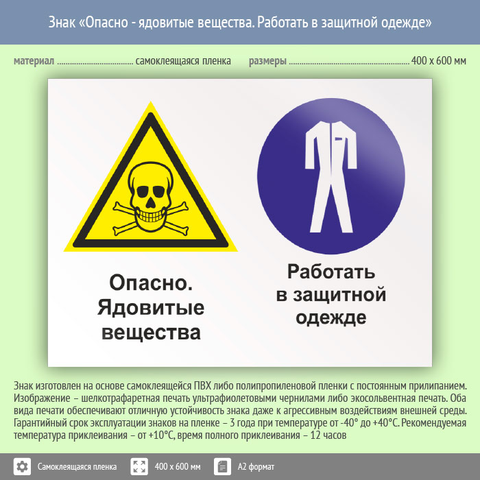 Знак «Опасно - ядовитые вещества. Работать в защитной одежде», КЗ-42 на пленке, размером 600х400 мм указывает на то, что здесь присутствуют вредные и ядовитые вещества и предписывает использовать средства защиты. Комбинированные знаки безопасности состоят из основных и дополнительных знаков с поясняющими надписями и предназначены для изложения комплексных требований, направленных на обеспечение безопасности