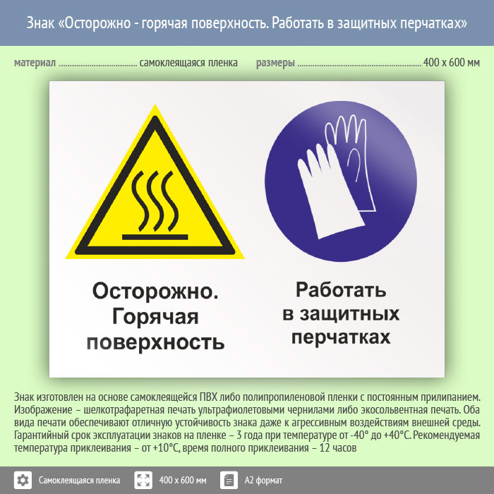 Знак «Осторожно - горячая поверхность. Работать в защитных перчатках», КЗ-55 на пленке, размером 600х400 мм предписывает использование средств защиты рук и предупреждает об опасности при работе. Комбинированные знаки безопасности состоят из основных и дополнительных знаков с поясняющими надписями и предназначены для изложения комплексных требований, направленных на обеспечение безопасности