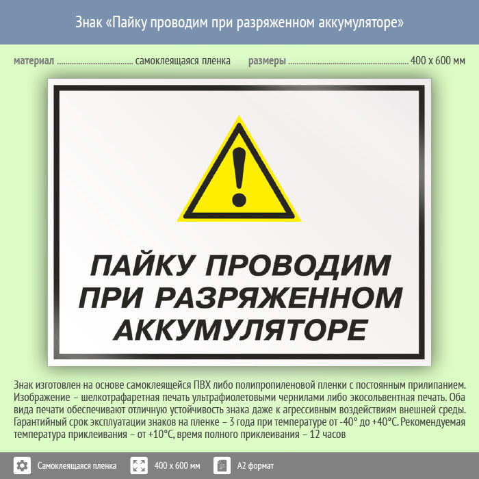 Знак «Пайку проводим при разряженном аккумуляторе», КЗ-62 (пленка, 600х400 мм)