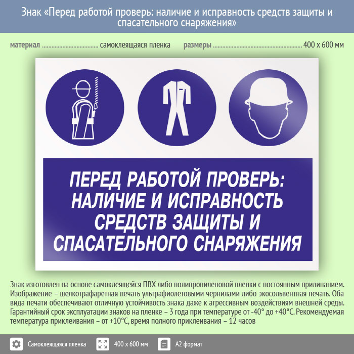 Знак «Перед работой проверь: наличие и исправность средств защиты и спасательного снаряжения», КЗ-64 на пленке, размером 600х400 мм напомнит о важности полного комплекта и целостности средств индивидуальной защиты. Комбинированные знаки безопасности состоят из основных и дополнительных знаков с поясняющими надписями и предназначены для изложения комплексных требований, направленных на обеспечение безопасности