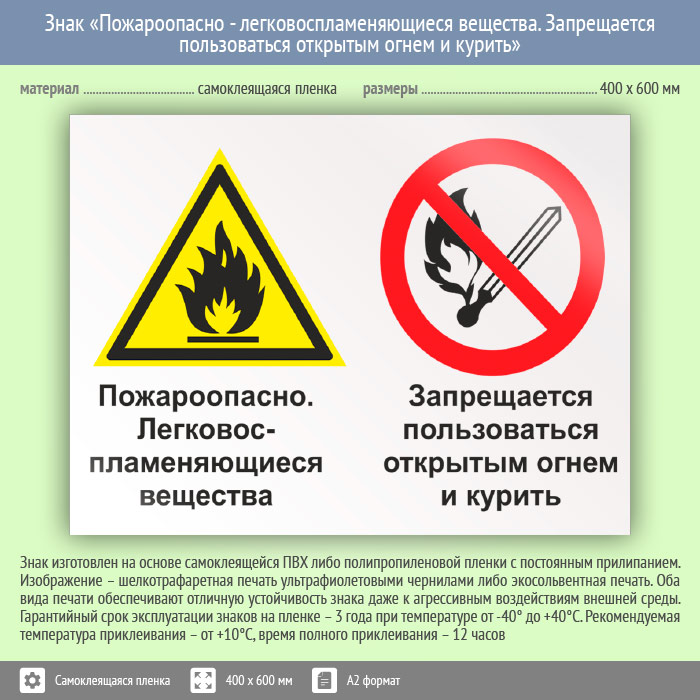 Знак «Пожароопасно - легковоспламеняющиеся вещества. Запрещается пользоваться открытым огнем и курить», КЗ-70 на пленке, размером 600х400 мм размещается в местах использования горючих веществ и сообщает об опасности использования огня и курения. Комбинированные знаки безопасности состоят из основных и дополнительных знаков с поясняющими надписями и предназначены для изложения комплексных требований, направленных на обеспечение безопасности