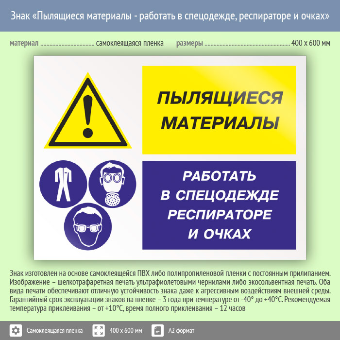 Знак «Пылящиеся материалы - работать в спецодежде, респираторе и очках», КЗ-79 на пленке, размером 600х400 мм сообщает о том, что при работе с пылящимися материалами важно использовать средства индивидуальной защиты. Комбинированные знаки безопасности состоят из основных и дополнительных знаков с поясняющими надписями и предназначены для изложения комплексных требований, направленных на обеспечение безопасности