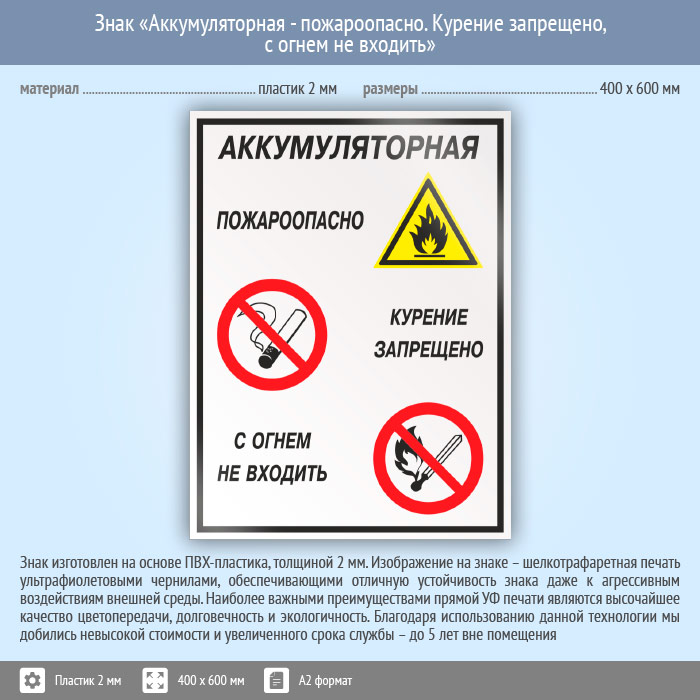 Знак «Аккумуляторная - пожароопасно. Курение запрещено, с огнем не входить», КЗ-01 на пластике, размером 400х600 мм размещается в аккумуляторных с повышенной категорией огне- и взрывоопасности. Комбинированные знаки безопасности состоят из основных и дополнительных знаков с поясняющими надписями и предназначены для изложения комплексных требований, направленных на обеспечение безопасности