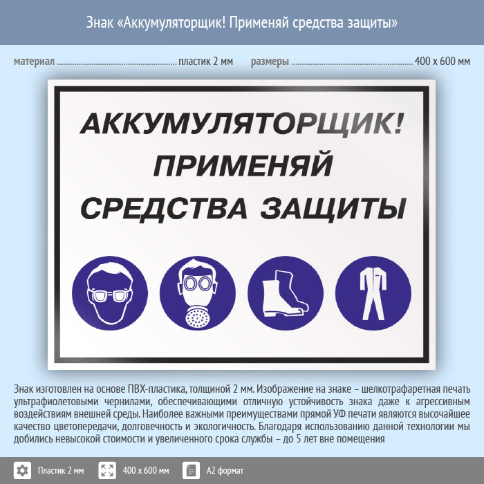 Знак «Аккумуляторщик! Применяй средства защиты», КЗ-02 на пластике, размером 600х400 мм напоминает персоналу, работающему с аккумуляторами о необходимости использования средств индивидуальной защиты. Комбинированные знаки безопасности состоят из основных и дополнительных знаков с поясняющими надписями и предназначены для изложения комплексных требований, направленных на обеспечение безопасности