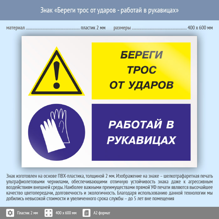 Знак «Береги трос от ударов - работай в рукавицах», КЗ-03 на пластике, размером 600х400 мм напомнит о важности использования средств защиты рук при работе с тросом. Комбинированные знаки безопасности состоят из основных и дополнительных знаков с поясняющими надписями и предназначены для изложения комплексных требований, направленных на обеспечение безопасности