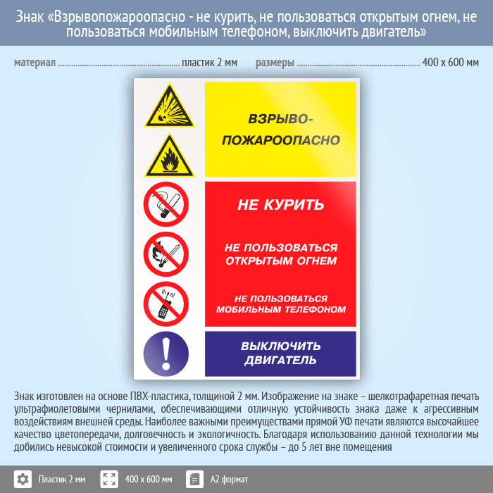 Знак «Взрывопожароопасно - не курить, не пользоваться открытым огнем, не пользоваться мобильным телефоном, выключить двигатель», КЗ-11 на пластике, размером 400х600 мм предупреждает об опасности использования огня, в том числе курение и использование мобильных телефонов, актуален на АЗС. Комбинированные знаки безопасности состоят из основных и дополнительных знаков с поясняющими надписями и предназначены для изложения комплексных требований, направленных на обеспечение безопасности