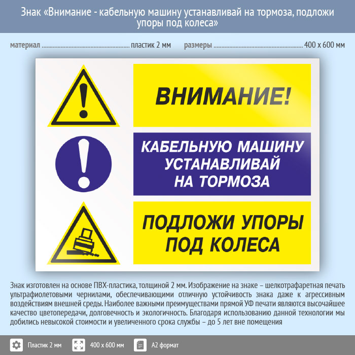 Знак «Внимание - кабельную машину устанавливай на тормоза, подложи упоры под колеса», КЗ-12 на пластике, размером 600х400 мм говорит сам за себя, что и как делать. Комбинированные знаки безопасности состоят из основных и дополнительных знаков с поясняющими надписями и предназначены для изложения комплексных требований, направленных на обеспечение безопасности