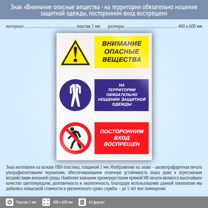 Знак «Внимание опасные вещества - на территории обязательно ношение защитной одежды, посторонним вход воспрещен», КЗ-15 на пластике, размером 400х600 мм предупреждает об опасности и обязательном ношении средств защиты, а также запрещает посторонним находится на данной территории. Комбинированные знаки безопасности состоят из основных и дополнительных знаков с поясняющими надписями и предназначены для изложения комплексных требований, направленных на обеспечение безопасности