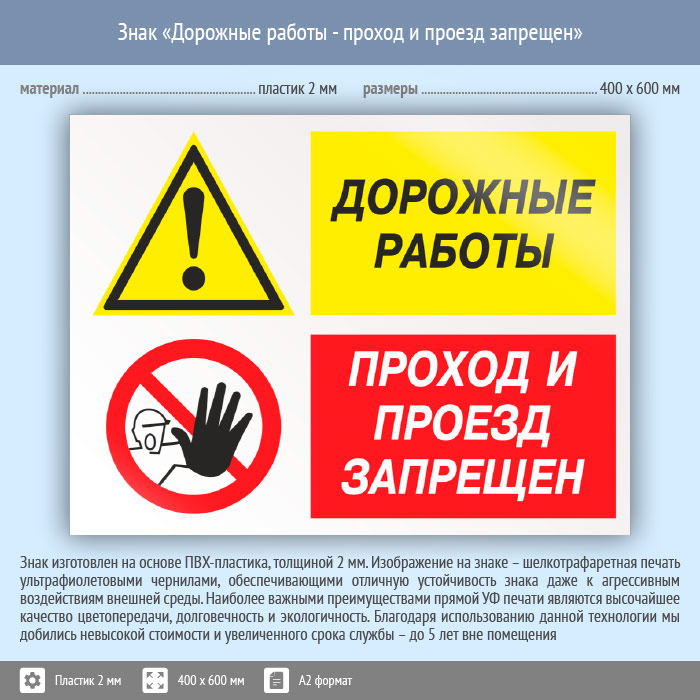 Знак «Дорожные работы - проход и проезд запрещен», КЗ-20 на пластике, размером 600х400 мм указывает, что проводятся дорожные работы и проход посторонним, а тем более проезд на данном участке закрыт. Комбинированные знаки безопасности состоят из основных и дополнительных знаков с поясняющими надписями и предназначены для изложения комплексных требований, направленных на обеспечение безопасности