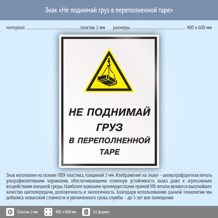 Знак «Не поднимай груз в переполненной таре», КЗ-26 на пластике, размером 400х600 мм напоминает об опасности перемещения груза в переполненной емкости. Комбинированные знаки безопасности состоят из основных и дополнительных знаков с поясняющими надписями и предназначены для изложения комплексных требований, направленных на обеспечение безопасности