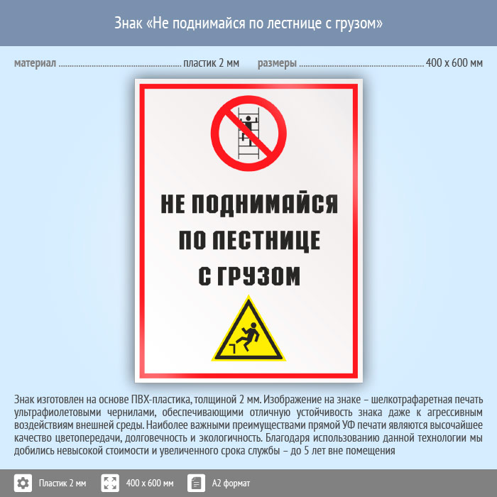 Знак «Не поднимайся по лестнице с грузом», КЗ-28 на пластике, размером 400х600 мм запрещает подъем людей с грузом. Комбинированные знаки безопасности состоят из основных и дополнительных знаков с поясняющими надписями и предназначены для изложения комплексных требований, направленных на обеспечение безопасности
