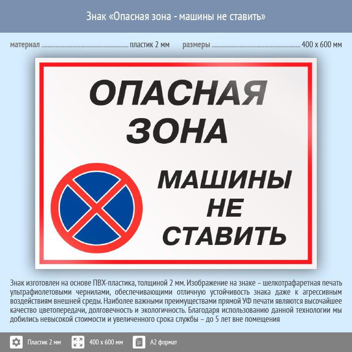 Знак «Опасная зона - машины не ставить», КЗ-32 на пластике, размером 600х400 мм обозначает опасное место или территорию и не рекомендует оставлять или парковать здесь машину. Комбинированные знаки безопасности состоят из основных и дополнительных знаков с поясняющими надписями и предназначены для изложения комплексных требований, направленных на обеспечение безопасности