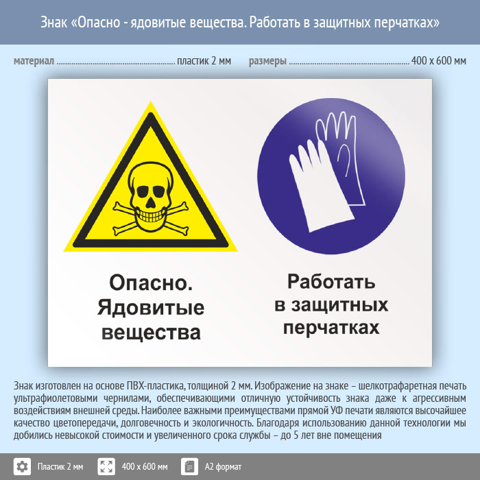 Знак «Опасно - ядовитые вещества. Работать в защитных перчатках», КЗ-43 на пластике, размером 600х400 мм сообщает о ядовитых веществах, предписывая использование средств защиты рук. Комбинированные знаки безопасности состоят из основных и дополнительных знаков с поясняющими надписями и предназначены для изложения комплексных требований, направленных на обеспечение безопасности