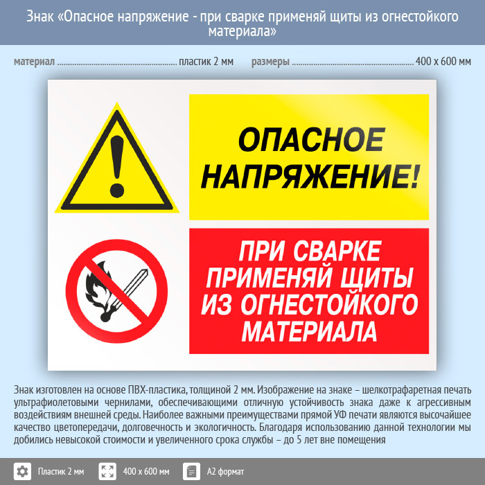 Знак «Опасное напряжение - при сварке применяй щиты из огнестойкого материала», КЗ-46 на пластике, размером 600х400 мм размещается в местах использования сварки для предупреждения электротравм. Комбинированные знаки безопасности состоят из основных и дополнительных знаков с поясняющими надписями и предназначены для изложения комплексных требований, направленных на обеспечение безопасности