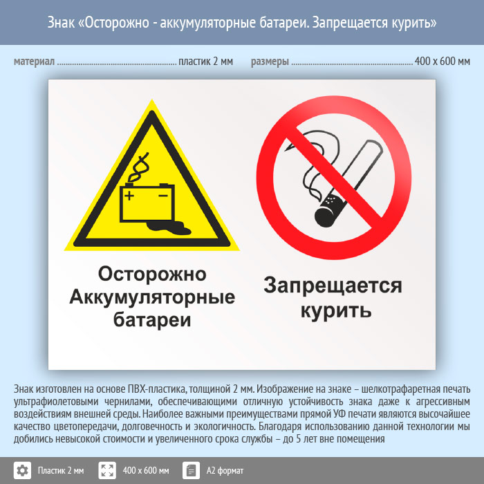 Знак «Осторожно - аккумуляторные батареи. Запрещается курить», КЗ-49 на пластике, размером 600х400 мм размещается в местах хранения и работы с аккумуляторами и предупреждает о вреде курения. Комбинированные знаки безопасности состоят из основных и дополнительных знаков с поясняющими надписями и предназначены для изложения комплексных требований, направленных на обеспечение безопасности
