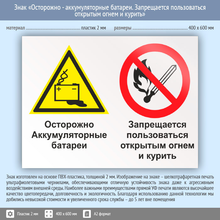 Знак «Осторожно - аккумуляторные батареи. Запрещается пользоваться открытым огнем и курить», КЗ-50 на пластике, размером 600х400 мм размещается в местах хранения и аккумуляторов и предупреждает о небезопасности использования огня и курения в данном месте. Комбинированные знаки безопасности состоят из основных и дополнительных знаков с поясняющими надписями и предназначены для изложения комплексных требований, направленных на обеспечение безопасности