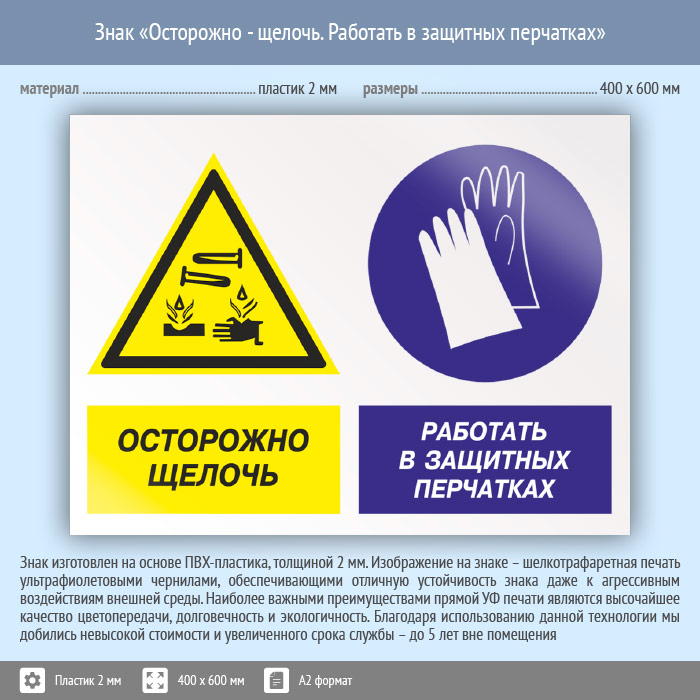 Знак «Осторожно - щелочь. Работать в защитных перчатках», КЗ-60 на пластике, размером 600х400 мм указывает на то, что здесь щелочь и использование средств защиты рук обязательно. Комбинированные знаки безопасности состоят из основных и дополнительных знаков с поясняющими надписями и предназначены для изложения комплексных требований, направленных на обеспечение безопасности