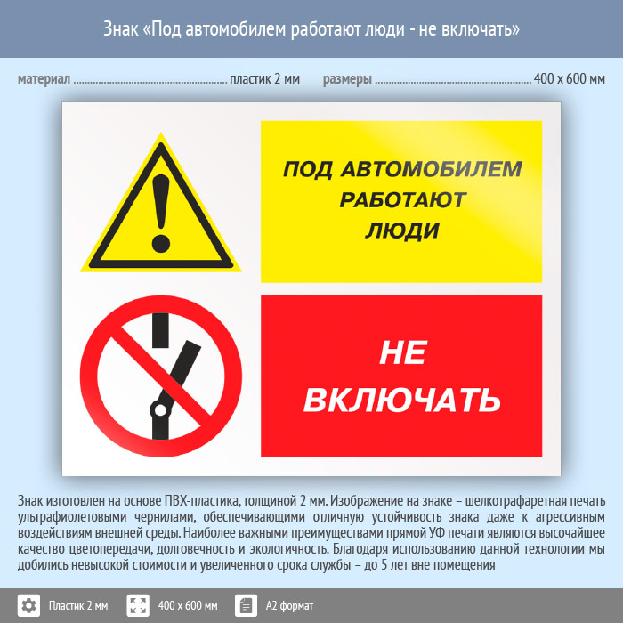 Знак «Под автомобилем работают люди - не включать», КЗ-65 на пластике, размером 600х400 мм подскажет, что в данном месте под автомобилем может находиться человек и прежде чем что-то включить надо сто раз подумать. Комбинированные знаки безопасности состоят из основных и дополнительных знаков с поясняющими надписями и предназначены для изложения комплексных требований, направленных на обеспечение безопасности