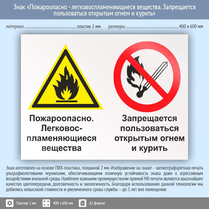 Знак «Пожароопасно - легковоспламеняющиеся вещества. Запрещается пользоваться открытым огнем и курить», КЗ-70 на пластике, размером 600х400 мм размещается в местах использования горючих веществ и сообщает об опасности использования огня и курения. Комбинированные знаки безопасности состоят из основных и дополнительных знаков с поясняющими надписями и предназначены для изложения комплексных требований, направленных на обеспечение безопасности