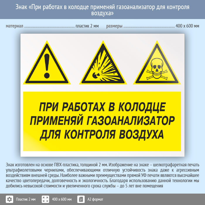 Знак «При работах в колодце применяй газоанализатор для контроля воздуха», КЗ-74 на пластике, размером 600х400 мм рекомендует делать анализ воздуха специальным прибором. Комбинированные знаки безопасности состоят из основных и дополнительных знаков с поясняющими надписями и предназначены для изложения комплексных требований, направленных на обеспечение безопасности