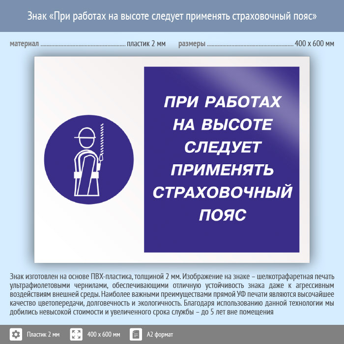Знак «При работах на высоте следует применять страховочный пояс», КЗ-75 на пластике, размером 600х400 мм напомнит об использовании страховочных ремней при работе на высоте. Комбинированные знаки безопасности состоят из основных и дополнительных знаков с поясняющими надписями и предназначены для изложения комплексных требований, направленных на обеспечение безопасности