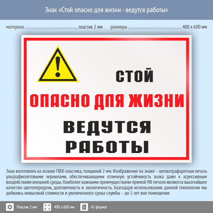 Знак «Стой опасно для жизни - ведутся работы», КЗ-86 на пластике, размером 600х400 мм вывешивается в месте проведения опасных работ для предотвращения опасных ситуаций. Комбинированные знаки безопасности состоят из основных и дополнительных знаков с поясняющими надписями и предназначены для изложения комплексных требований, направленных на обеспечение безопасности