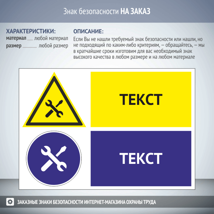 Если Вы не нашли нужный Вам комбинированный знак безопасности или нашли, но неподходящий по каким-либо критериям, – обращайтесь, – мы в кратчайшие сроки изготовим для вас необходимый знак высокого качества в любом размере (от 1 см2 до 4 м2) и на любом материале