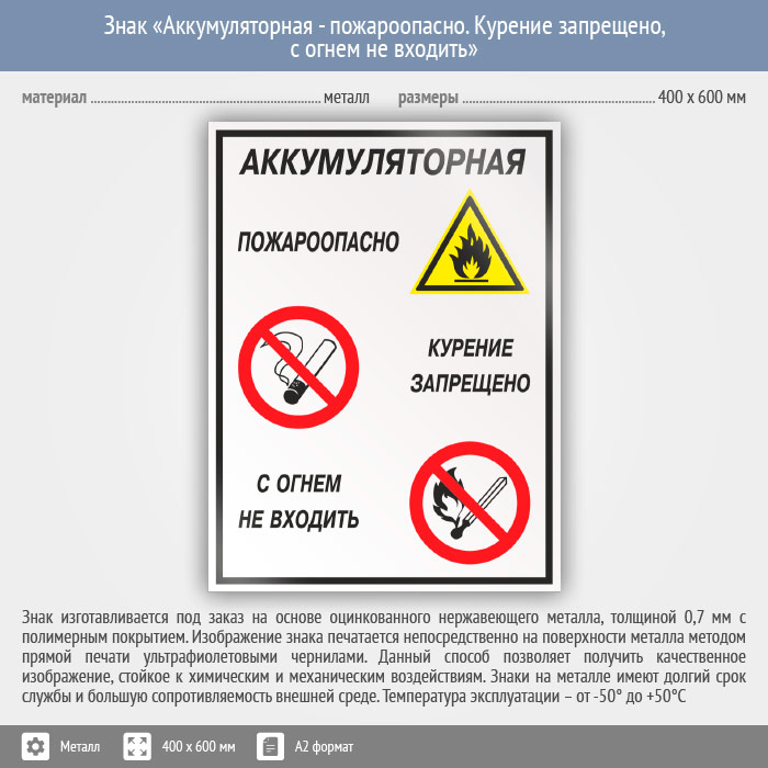 Знак «Аккумуляторная - пожароопасно. Курение запрещено, с огнем не входить», КЗ-01 на металле, размером 400х600 мм размещается в аккумуляторных с повышенной категорией огне- и взрывоопасности. Комбинированные знаки безопасности состоят из основных и дополнительных знаков с поясняющими надписями и предназначены для изложения комплексных требований, направленных на обеспечение безопасности