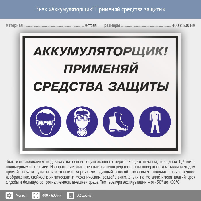 Знак «Аккумуляторщик! Применяй средства защиты», КЗ-02 на металле, размером 600х400 мм напоминает персоналу, работающему с аккумуляторами о необходимости использования средств индивидуальной защиты. Комбинированные знаки безопасности состоят из основных и дополнительных знаков с поясняющими надписями и предназначены для изложения комплексных требований, направленных на обеспечение безопасности