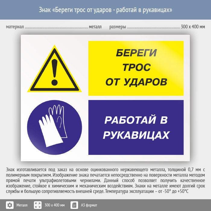 Знак «Береги трос от ударов - работай в рукавицах», КЗ-03 на металле, размером 400х300 мм напомнит о важности использования средств защиты рук при работе с тросом. Комбинированные знаки безопасности состоят из основных и дополнительных знаков с поясняющими надписями и предназначены для изложения комплексных требований, направленных на обеспечение безопасности